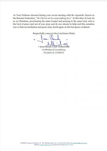È con profondo dolore nel mio cuore che mi rivolgo oggi a Lei come Presidente della. Commissione delle Conferenze Episcopali Cattoliche dell'Unione Europea (COMECE) e come fratello fedele in Nostro Signore Gesù Cristo.